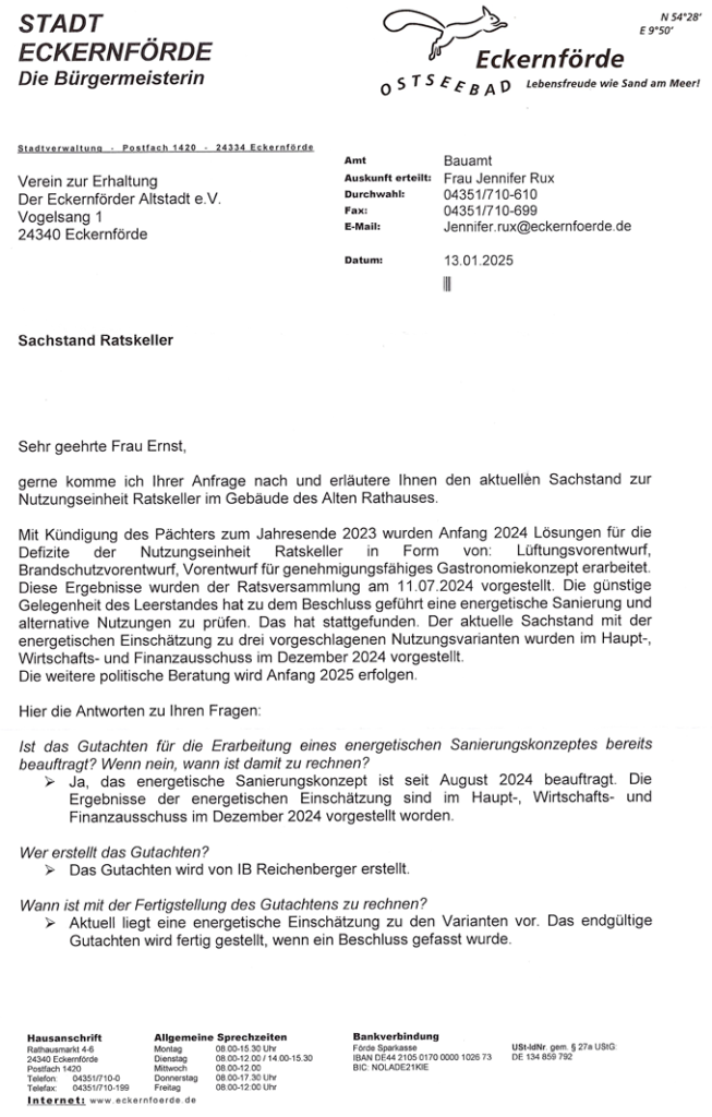 Die Eckernförder Zeitung veröffentlichte am 14.Dezember 2024 einen Artikel zu drei neuen Nutzungskonzepten des Ratskellers, die im Haupt-, Wirtschafts- und Finanzausschuss der Stadt vorgestellt wurden. Ein Schreiben mit Darstellung der Sichtweise des Altstadtvereins diesbezüglich soll mit folgendem Inhalt an die Bürgermeisterin verfasst werden: