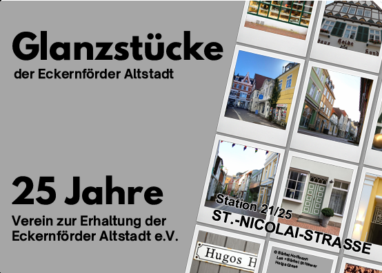 Die Anzahl 25 ergibt sich anlässlich des 25-jährigen Bestehens des Vereins automatisch. Aber “Glanzstücke“ gibt es bei Weitem in größerer Anzahl in der imposanten und maritim geprägten Altstadt Eckernfördes. Die Auswahl fiel daher nicht leicht. Es sollten möglichst viele Straßenzüge bedacht werden. Wünschenswert waren auch Objekte, die nicht ständig im Mittelpunkt der Betrachtung stehen. Zudem war angedacht, die Objekte in einen Rundgang durch die Altstadt einzubetten.