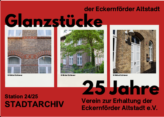 Die in dieser Rubrik erscheinenden 25 “Glanzstücke“ sind das Ergebnis des Auswahlprozesses. Außer an dieser Stelle auf unserer Homepage präsentiert sich der Altstadtverein Eckernförde ab Ende März 2025 alle 14 Tage auf dem Wochenmarkt auf dem Rathausmarkt/Kirchplatz. Dort haben Sie die Möglichkeit, Postkarten zu den “Glanzstücken“ mitzunehmen, um diese mal wieder im Original zu betrachten und nicht nur daran vorbeizugehen. Alle zwei Wochen erscheinen zwei neue Objekte. Wir warten auf Sie ab dem 22.März 2025, jeweils vierzehntägig, von 10.00 Uhr bis 12.00 Uhr und kommen gern mit Ihnen ins Gespräch!