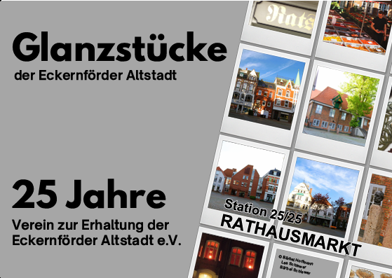 Die in dieser Rubrik erscheinenden 25 “Glanzstücke“ sind das Ergebnis des Auswahlprozesses. Außer an dieser Stelle auf unserer Homepage präsentiert sich der Altstadtverein Eckernförde ab Ende März 2025 alle 14 Tage auf dem Wochenmarkt auf dem Rathausmarkt/Kirchplatz. Dort haben Sie die Möglichkeit, Postkarten zu den “Glanzstücken“ mitzunehmen, um diese mal wieder im Original zu betrachten und nicht nur daran vorbeizugehen. Alle zwei Wochen erscheinen zwei neue Objekte. Wir warten auf Sie ab dem 22.März 2025, jeweils vierzehntägig, von 10.00 Uhr bis 12.00 Uhr und kommen gern mit Ihnen ins Gespräch!