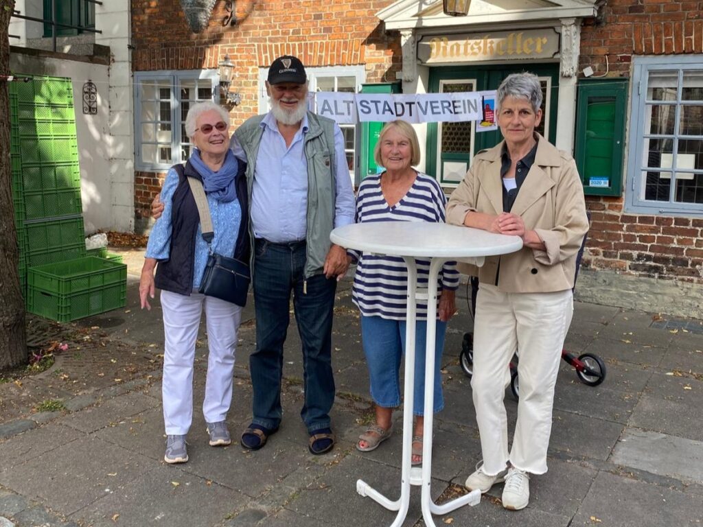 Mit Genehmigung des Ordnungsamtes der Stadt Eckernförde durfte sich der Altstadtverein am 22.03.2025 das erste Mal auf dem Wochenmarkt präsentieren. Der Standort direkt vor der Rathaustreppe sollte nun alle 14 Tage samstags, jeweils von 10.00 bis 12.00 Uhr für die Präsentation der „Glanzstücke“ der Eckernförder Altstadt genutzt werden. Zuvor hatten Artikel in der Eckernförder Zeitung und Hallo Eckernförde bereits über die anstehende Aktion berichtet. Mit Stehtisch, Banner und den jeweiligen neuen Glanzstück-Postkarten im Gepäck standen Mitglieder des Vereins dort bereit, mit den Wochenmarktbesuchern ins Gespräch zu kommen. Bereits das erste Mal war von Erfolg gekrönt.